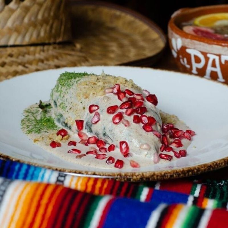 El tradicional chile poblano capeado, bañado en salsa de jitomate.